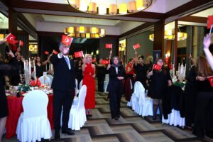 KOİDER yönetim kurulu geceye anlam katan özel bir an daha ekledi. Hem Cumhuriyet’in 102. yıl dönümü hem de ekim ayında doğan üyelerin doğum günü, pasta kesilerek kutlandı. Ardından sahneye çıkan tüm üyeler ellerine aldıkları Türk bayraklarıyla hep bir ağızdan büyük bir coşkuyla marşlar söyledi. Salondaki atmosfer bir anda bir balodan çok daha fazlasına dönüştü; bir milletin, bir ideali kutladığı görkemli bir an yaşandı.