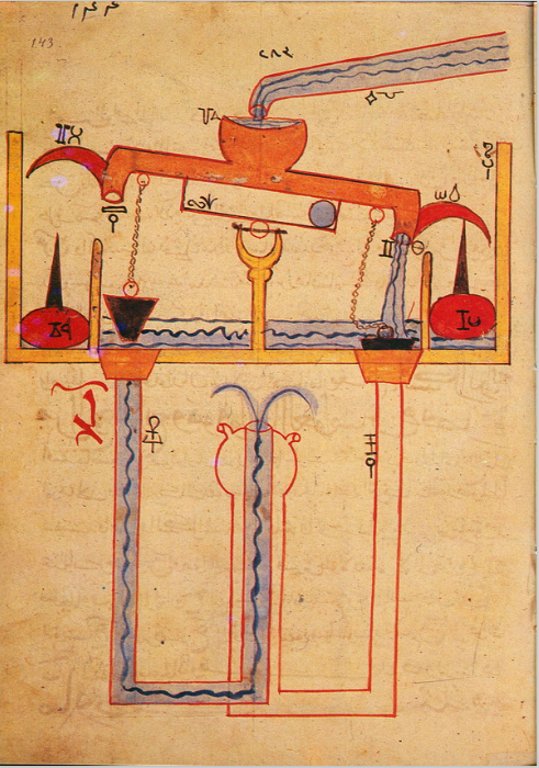 El Cezerî’nin yazdığı kitabın 10 nüshası var. İstanbul’da 2. Ahmet Kütüphanesi’ne kayıtlı orijinal bir nüsha bulunuyor. Aslında bir nüsha daha var İstanbul’da ama bazı sayfaları yırtılarak çalınmış; yurt dışına çıkarılmış. Günümüze ulaşmış en eski el yazması ise Topkapı Sarayı’nda bulunan 2. Ahmet Kütüphanesi’ne kayıtlı. Kitabında 50’den fazla otomatik makinenin renkli çizimlerine ve çalışma prensiplerine yer vermiş. Renkleri hala capcanlı duran, çok keyifli bir kaynak. Renkli çizimler hala bir resim tablosu gibi duruyor.