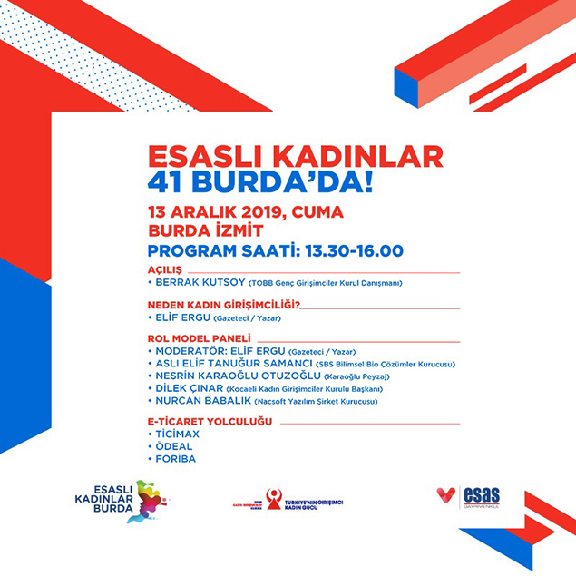 Esas Gayrimenkul tarafından hayata geçirilen ve açıldığı günden itibaren Kocaeli halkına özel deneyimler yaşatan 41 Burda AVM, 13 Aralık Cuma günü 13.30 – 16.00 saatleri arasında Esas Gayrimenkul ile Türkiye Odalar ve Borsalar Birliği Kocaeli Kadın Girişimciler Kurulu işbirliğinde düzenlenecek 'Esaslı Kadınlar' söyleşinde ziyaretçilerini ağırlayacak.