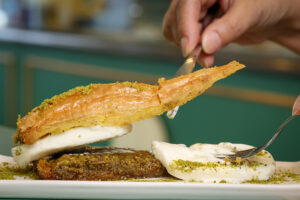 Fıstığın tamamı kendi üretimimiz, Gaziantep’ten geliyor. Tatlılarımız ise burada, Gaziantepli ustalarımız tarafından günlük olarak üretiliyor. Böylece hem tazelikten ödün vermiyoruz hem de gerçek Gaziantep fıstığını yerinde işleyerek müşteriye sunuyoruz.