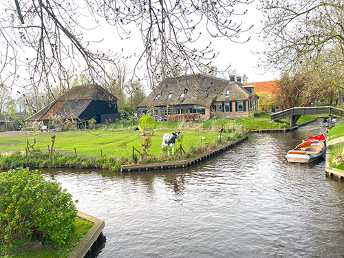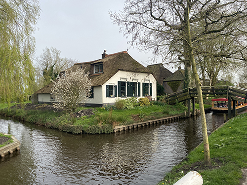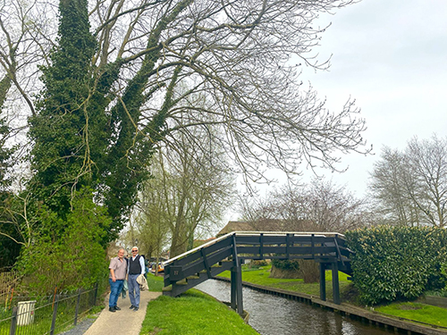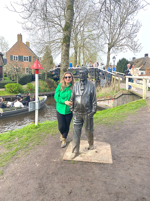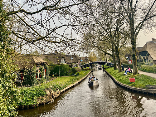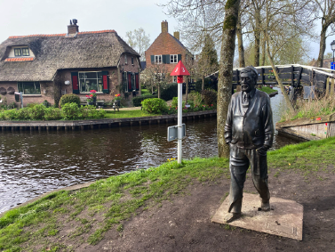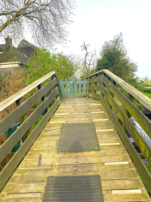 Kanal boyunca yürürken evlere giden köprülerin bazılarında kilitli ya da zincirli kapılar gördük ki bu köprüler, şahısların özel mülküymüş, dolayısıyla geçilemiyor. Köyde yaşayan herkesin mutlaka teknesi vardır ama acil bir durumda karşıya geçerek anayola ulaşmak için köprü de şart. Bu nedenle anayolun karşısında evi olanlar, köprü de inşa ettirmişler. Böylece kanalın üzerinde çoğunluğu ahşap olan irili ufaklı 176 köprü, köyü daha da sevimli hale getirmiş… Kanal boyunca evlerin yanı sıra oteller, restoranlar, kafeler, hediyelik eşya dükkanları, heykeller karşınıza çıkıyor. Heykellerden en dikkat çekenler; heykeltraş Wim Kuijl’nin eseri Albert Mol Heykeli ve Jan Krikke’nin eseri Gieters Dansçıları.