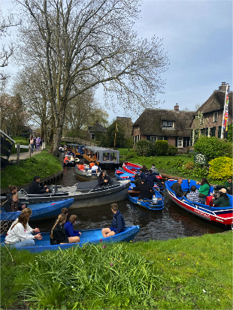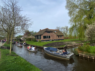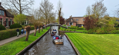 Köyün içine araçla girilemiyor zira araçların girebileceği genişlikte bir yol yok. Bu nedenle köyün dışında bulunan otoparklardan birine aracımızı bırakıp yürümeye başlıyoruz. Köye girdiğimizde Orta Çağ’dan kalma tarihi bir dokuyla karşılaşıyoruz, sanki bir açık hava müzesinin ortasına düşmüşüz gibi hissediyoruz. Yemyeşil bir doğanın içindeki su kanalları ve üzerinde ahşap köprüler, kargılarla kaplı çatıları ile hobit evlerini anımsatan geleneksel evler, rengarenk çiçeklerle bezenmiş bahçeler, adeta masallardaki tasvirlere benziyor. Köyün yaklaşık üç bine yakın nüfusu var. Ancak yıl boyunca yaklaşık bir milyondan fazla turist köyü ziyaret ediyor. Dolayısıyla Giethoorn’da yaşayanların geçim kaynakları otel, restoran ve tekne işletmeciliği gibi turizm etkinliklerine dayanıyor. Köyde yüzlerce ziyaretçi olmasına rağmen öyle huzurlu ve sakin bir ortam var ki şaşarsınız.