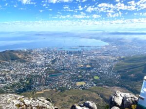 Sonra ver elini Masa Dağı. İnanılmaz bir deneyim. Bir yanda Atlantik Okyanusu bir yanda Masa Dağı… Bembeyaz bulutlar, masmavi bir gökyüzü. Net olarak söylüyorum ben bu dünyada böyle mavi ve böyle beyazı hiçbir yerde görmedim. Teleferikle yukarı çıkarken rehberimiz “Eğer bulut inerse dağın üstüne hiçbir şey göremeyiz” demişti, şanslıydık, inmedi. Bulutların üstündeyiz artık o kadar yüksekteyiz neredeyse. Bu arada ilginç olan bulutlar dağın üstüne indiği zaman örtü gibi durduğundan “masa örtüsü” diyorlarmış o bulutlara. Bütün şehir ayaklarımızın altında, mis gibi bir hava.