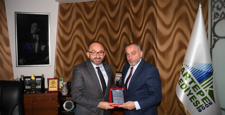 Kartepe Belediye Başkanı Hüseyin Üzülmez’i makamında ziyaret eden Belediye Başkan Yardımcısı Murat Sabri Çakır’da Kocaeli Üniversitesi adına eğitime, bilime ve gençliğe verilen desteğin yanı sıra 20 farklı ülkeden yoğun bir katılım ile gerçekleşen Uluslararası Marmara Fen ve Sosyal Bilimler Kongresi’ne (IMASCON 2018) desteklerinden dolayı KOÜ’nin layık gördüğü teşekkür plaketini verdi.