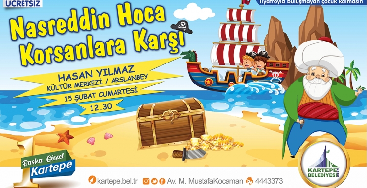 Kartepe Belediyesi Kültür ve Sosyal İşler Müdürlüğü’nün kültür- sanat etkinlikleri kapsamında düzenlediği ücretsiz tiyatro günleri “Nasreddin Hoca Korsanlara Karşı” adlı çocuk oyunuyla devam ediyor. Arslanbey Hasan Yılmaz Kültür Merkez’inde 15 Şubat Cumartesi Günü Saat:12.30’da perde açacak olan çocuk komedi oyunu tek perde oynanacak ve yaklaşık 40 dakika sürecek.