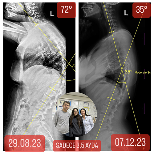 Neyse ki Elif Akıncı’nın verdiği bilgi içimizi rahatlattı. Elif Hanım bize ilk etapta 3.5 aylık bir program hazırladı. Bir ayın sonunda Yağmur’un omuzları dikleşti, boyu uzadı, dış görünüşündeki değişimle ilgili çevremizden de olumlu geri bildirimler almaya başladık. 3.5 ayın sonunda kifozu 72 dereceden 35 dereceye geriledi. Doktorumuz; ‘Siz kime gittiniz, ne yaptınız?’ diye defalarca sordu. Ameliyata gerek olmadığını duyunca mutluluktan ağladık. Elif Akıncı Pozitif Yaşam Merkezi’ni tüm çevreme öneriyorum.”