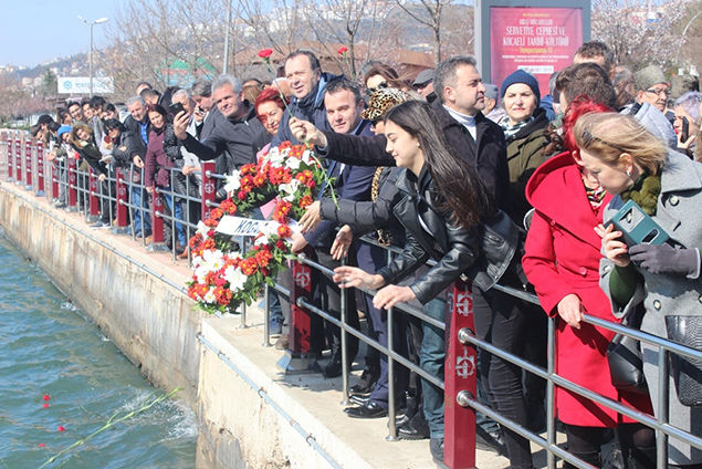 Anma programında İzmit Marina'da 1 Mart Vapur İskelesi önünden faciada yaşamlarını kaybedenler anısına denize kırmızı karanfil ve çelenkler bırakıldı.