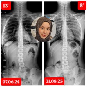 Zamanla ağrılarımın azalmaya başladığını fark ettim. Özellikle pilates çalışmaları sayesinde vücudumda ciddi bir rahatlama oldu. Elif Akıncı’nın önerdiği özel hareketlerle birleşince, pilatesin etkisi daha da belirgin oldu. Düzenli ve disiplinli çalışmaların ardından yapılan doktor kontrolünde, skolyozumun 13 dereceden 8 dereceye gerilediği görüldü. Artık vücudumun rahatladığını net bir şekilde hissediyorum. Bu aslında oldukça zorlu ve sabır gerektiren bir süreç ancak verilen hareketleri daha iyi hissedeceğimin bilinciyle ve elimden gelen çabayı göstererek yapmaya çalıştım.