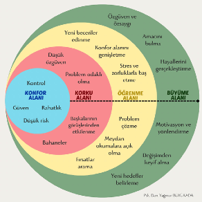 Konfor alanında stres minimum seviyededir fakat zihin yeniliklere açık değildir. Burada kişi; yeni ilişkiler kurmak, yeni yerler keşfetmek, yeni aktiviteler edinmek gibi birçok sosyal-kültürel zenginlikten mahrum kalabilir. Kendinize, içinizde bulunduğunuz koşulları düşünerek şu soruları sorun: ‘Bu yaptığım şeylere yakın mıyım, mutlu muyum ve başka neye ihtiyacım var?’ Eğer cevabınız ‘belki’, ‘emin değilim’ vb. ise önce küçük adımlarla başlayabilirsiniz. Bu küçük adımlar bizleri büyük değişimlere hazırlar.